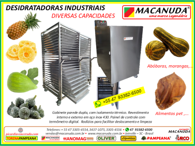 www.macanudavencetudo.com; www.picardiavencetudo.com / Desidratadoras (Estufas, Secadoras) de frutas, peixes, hortaliças, pólen, ervas, chips de coco, queijos,... Gabinete parede dupla, com isolamento térmico em lã de rocha. * Revestimento interno e externo em chapa de aço inox AISI 430. * Termômetro digital. * Turbo para ventilação horizontal entre as bandejas. * Bandejas em aço inox 430, alumínio (chapa expandida) ou tela de nylon ou aço inox. Diversos modelos e capacidades. Aquecimento elétrico, misto (elétrico e gás) ou somente a gás.